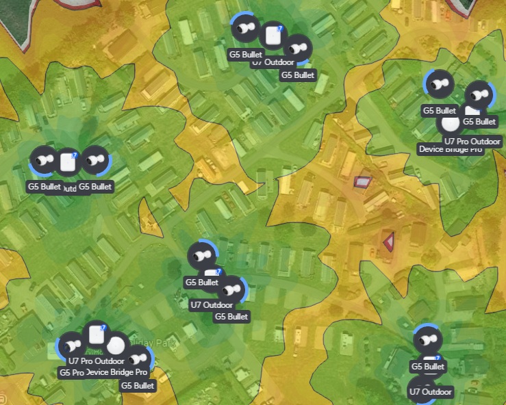 The diagram below shows a partial high capacity Wireless Network design for a Static Holiday park at scale.